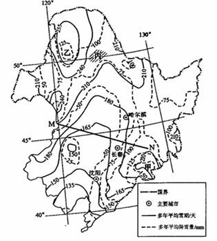(1)根据等雪期线的分布,分析沿MN一线的地形分布特点。