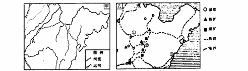 [解析]甲图中A河是黄河,由于黄河在山东境内是地上河使得该流域段许多河流没有注入黄河;乙图中③地是日照,在此建设大型钢铁企业最大区位优势就是接近输入原料和燃料的港口,可节省运费,降低成本以及 由分散到集中会取得规模效益。