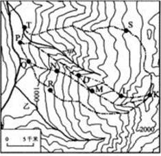 5.拟在K点与T点之间选择起伏较平缓的路线.修建供拖拉机通行的道路.合理的路线是