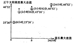 [解析]③地昼长最大差值是0,在赤道地区。②地昼长最大差值是24小时,有极昼极夜现象,正午太阳高度最大差值为46°52′,故在极圈上,一般来说,昼长最大差值越大,纬度越高。