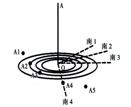 [解析] 影长相同的两个轨迹A2与A3;影长相同(即太阳高度角相同)的两个时间点距离正午的时间间隔相同,利用这一规律推出OA2,OA3的角平分线就是正午的影子,最后确定它的反向延长线(即南2)就是该地的正南方位。
