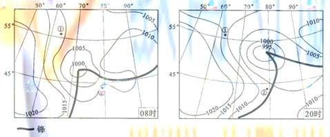图是某日08时和20时海平面气压分布图(单位:百帕)。读图,回答第9题。