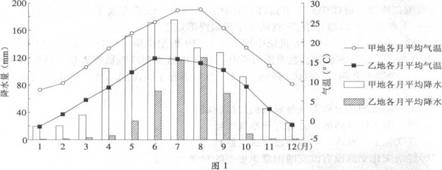 11.我国甲、乙两地均位于29°N附近。读“1971-2000年甲、乙两地各月气温和降水分布图”,可知