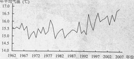 《安徽省应对气候变化方案》提出,安徽省应对气候变化面临巨大挑战,必须加快推进产业结构优化升级,转变经济发展方式。下图表示1962年~2007年安徽省年平均气温变化。完成14-15题。