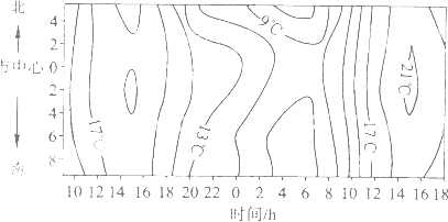 [解析]17.本题主要考查读图判断分析问题的能力。由题图,图示地区中的两条相邻的等温线的温度差为2°C;通过仔细观察图示区域,9日6点左右市中心北部6千米附近温度最低5-7℃,9日15点左右市中心附近温度最高21-23℃,所以最大温差取值为14-18℃,C选项16℃正确。