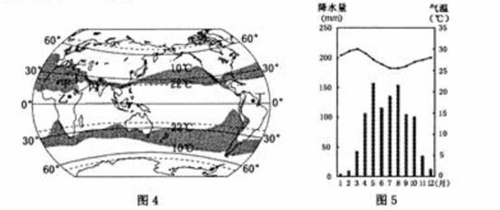 图4为世界1月平均气温10-22℃范围示意图,图5为某地年内各月气温变化曲线与降水量柱状图。读图回答20-21题。