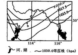 [解析]在解题时可以将b点向偏西方向平移120千米,图上约在最西边经线附近,在对比前后的风向、风力,结果是原来风向为西北风、风力有所加大,此时为西南风,气温可能上升。