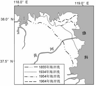 [解析](1)考查区域地理环境的变化及其原因。从图中可以看出由于黄河流经黄土高原,携带大量泥沙进入下游入海口,由于流速减慢,泥沙不断沉积形成陆地。所以该区域陆地面积在不断扩大,并且不断向东北方向扩展;由于泥沙不断在增加,所以延伸速度越来越快。