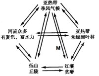 [解析]从图中看出该地区地形、气候、水文、商务、土壤各要素之间相互影响,相互制约,这体现了地理环境的整体性;亚热带季风气候的高温多雨使得有机质分解快,积累少,土壤贫瘠。