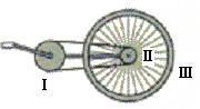 (6分)小明同学在学习了圆周运动的知识后,设计了一个课题,名称为:快速测量自行车的骑行速度。他的设想是:通过计算踏脚板转动的角速度,推算自行车的骑行速度。如图是自行车的传动示意图,其中Ⅰ是大齿轮,Ⅱ是小齿轮,Ⅲ是后轮。当大齿轮Ⅰ(脚踏板)的转速通过测量为n(r/s)时,则大齿轮的角速度是 rad/s。若要知道在这种情况下自行车前进的速度,除需要测量大齿轮Ⅰ的半径r1,小齿轮Ⅱ的半径r2外,还需要测量的物理量是 。用上述物理量推导出自行车前进速度的表达式为: 。