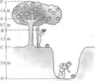 7.一棵树上有一个质量为0.3kg的熟透了的苹果P,该苹果从树上A先落到地面C最后滚入沟底D。已知AC、CD的高度差分别为2.2m和3m,以地面C为零势能面,A、B、C、D、E面之间竖直距离如图所示。已知重力加速度为