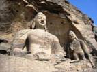 20、下面两幅图片分别是云冈石窟和龙门石窟的典型雕刻大佛。前一幅为云冈石窟,其雕刻佛面方圆,两肩齐平,深目高鼻,衣纹厚重突起,线条简明,是典型的胡人形象。后一幅是龙门石窟,无论佛像造型,还是龛饰壁雕,都具有中原文化的特征。这种变化反映了的趋势是