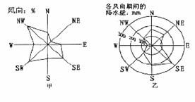 读某城市的风向玫瑰图(全年各月平均风向频率)和雨量与风向关系图(某风向期间的降雨量),回答15-17题。