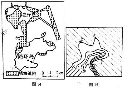(3)图15所示为澳门某处海湾,在发展规划中A、B、C、D为规划土地,A、B两地可否建港 ,理由是 。C、D两处相比较, 处更适宜建港,理由是 。