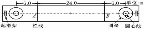 233.(吉林省吉林市普通中学2010届高三下学期期中教学质量检测试题)(2))下图是新兴的冰上体育比赛“冰壶运动”的场地(水平冰面)示意图,实际尺寸如图为已知,要令球队获胜你需要推出你的冰壶石以使其停留在以O为圆心的圆心线之内,并把对手的冰壶石击出同样以O为圆心的圆垒之外。已知圆心线半径r=0.6m,而圆垒的半径R=1.8 m,在某次比赛中,甲队队员以速度
