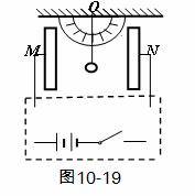 252. 河南省实验中学2010届高三上学期第二次月考用下面的方法可以测量物体的带电量。图10-19中小球是一个外表面镀有金属膜的空心塑料球,用绝缘丝线悬挂于O点,O点固定一个可测量丝线偏离竖直方向角度的量角器,M、N是两块相同的、正对着平行放置的金属板(加上电压后其内部电场可视为匀强电场).另外还要用到的器材有天平、刻度尺、电压表、直流电源、开关、滑动变阻器及导线若干。 简要的实验步骤如下:(请按要求完成相应的解答)