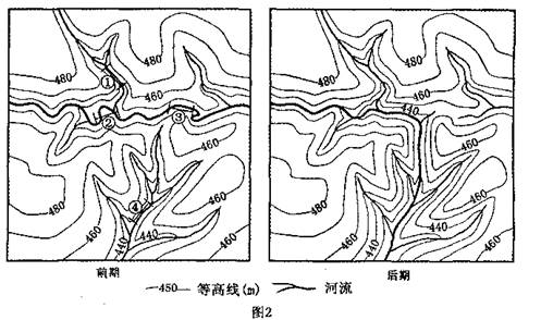 图2示意某区域两个不同时期河流地貌发育情况。读图完成5-6题。