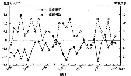 图12示意中国1951~1981年地表温度距平与寒潮频次的变化。读图完成下列问题。