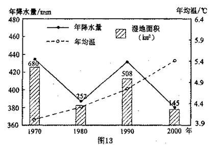 图13示意吉林省某地1970~2000年湿地面积、年均温与年降水量的变化。读图完成下列问题。