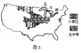 图5为“美国本土小麦区和玉米带分布示意图”。读图完成18-19题。