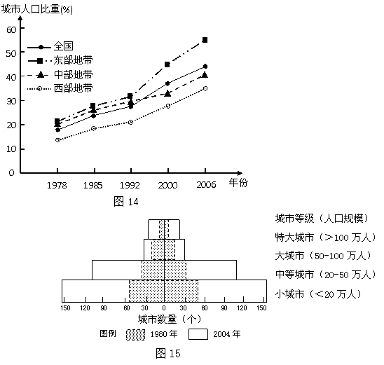 (1)读图14、15,分析改革开放以来我国城市化进程的主要特点。(答三点以上6分)
