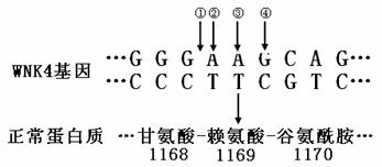 下图为人WNK4基因部分碱基序列及其编码蛋白质的部分氨基酸序列示意图。已知WNK4基因发生一种突变,导致1169位赖氨酸变成了谷氨酸。该基因发生的突变是