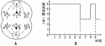 (8分)下列图A是某基因组成为AaBbdd的雌性高等动物细胞分裂过程中某时期的染色体和基因示意图(● 和 〇 表示着丝点,1表示的染色体是X染色体),图B是该生物配子形成过程中细胞内染色体数变化的曲线图。请据图回答: