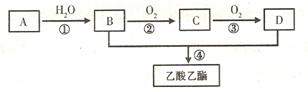 22.(8分)A是一种气态烃。B和D是生活中两种常见的有机物。以A为主要原料合成乙酸乙酯,其合成路线如下图所示: