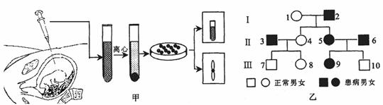 (2)某次羊水检查中发现一男性胎儿(上图乙中的III-10)表现正常,但调查却发现其姐姐(上图乙中的III-9)患有某种遗传病(用A、a表示)。请根据图乙,分析并回答下列问题:
