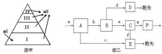 32.(8分)下图甲为某湖泊生态系统的能量金字塔简图,其中I、Ⅱ、Ⅲ、Ⅳ分别代表不同的营养级,m1、m2代表不同的能量形式。图乙表示能量流经该生态系统某一营养级的变化示意图,其中a-g表示能量值的多少。请据图作答: