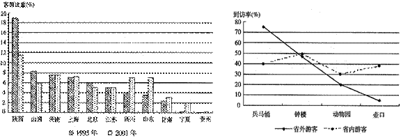 读图,西安市国内游客构成省际变化图(左下);游客对西安市及周边旅游景点到访率统计图(右下),完成20-21题。