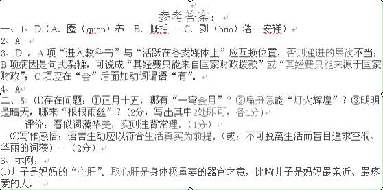 5、下面一段文字摘自某学生的作文,表达上有一些问题,请你结合具体语句,写一段评语。要求:⑴写出存在问题并略作评价;⑵总结出写作感悟。(20字以内) (5分)