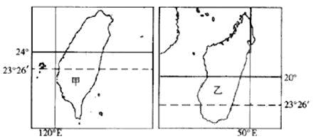 C.甲岛的热带面积小于乙岛 D.甲岛南端自转线速度小于乙岛南端