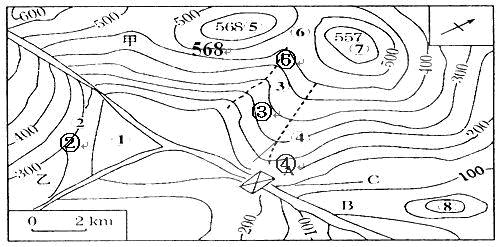 (2) ⑤、⑦两地的相对高差为_______________m,若两地图上水平距离为2.3cm,其实际水平距离是_____________km。
