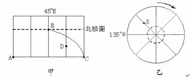 28.在甲、乙两图中,AC为赤道,BC为晨昏线的一部分,B点的地方时比A点的早,此时D点的地方时为15时,据此读图完成下列要求。(14分)
