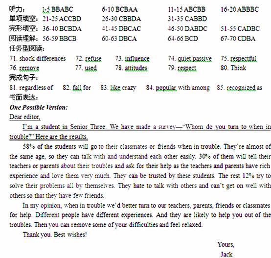 假如你叫Jack,参加学校开展的“有困难向谁求助?(Whom do you turn to when in trouble?)”的调查活动,调查结果如下表。请用英语给校报编辑写一封信反映相关内容并表达出你的观点。