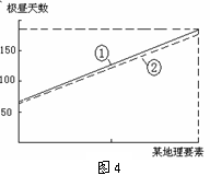 图4是极地附近极昼天数随某地理要素变化图。据此回答6-7题。