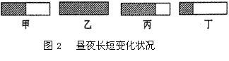 1.地球位于A点时,根据图2中昼夜状况(阴影部分表示黑夜)判断甲、乙、丙、丁四地中地球自转线速度最快的是