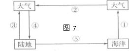 读全球大气环流剖面示意图(图6)和海陆间循环示意图(图7),据此回答9-11题。