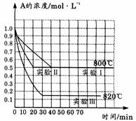 在一恒容密闭容器中发生某化学反应2A(气) B(气)+C(气)。在三种不同条件下进行,其中实验Ⅰ、Ⅱ在800℃,实验Ⅲ在820℃,B、C的起始浓度都为0,反应物A的浓度