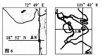 10.有一位印度商人于2010年3月21日当地时间7时30分搭乘飞机从孟买(图6)出发,计划下午查看世博会印度场馆,晚上洽谈生意,经历了5小时20分钟的飞行,到达上海(图7),这一天他实际经历的昼长大约是