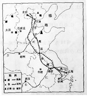 (10分)具有世界先进水平的高速铁路--京沪高速铁路,全长1318km,预计2010年年底全线贯通。图为“我国部分区域示意图”。读图完成下列问题。(10分)