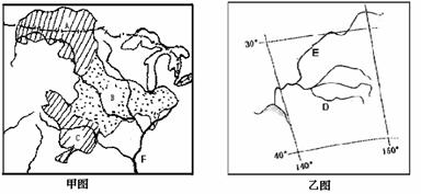 (1)甲、乙图中河流名称是:D ;E ;F 。