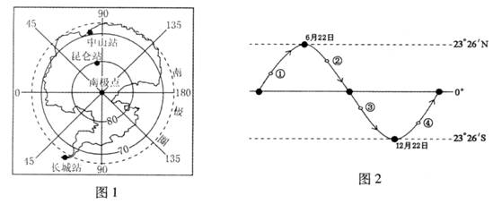 左图为“我国三个南极科学考察站分布示意图”,其中昆仑站于2009年1月27日建成,这是我国在南极内陆建立的第一个科学考察站。右图为“太阳直射点回归运动示意图”。读图完成13一14题。