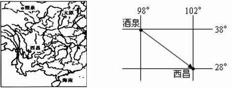 左图为我国四大卫星发射基地,某日酒泉昼长11时20分,西昌昼长11时40分。某航天专家上午11时乘飞机从酒泉到西昌参观“嫦娥一号”卫星发射,途中飞行3小时。据此和