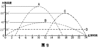 14.图9中A、B、C、D四条曲线表示不同纬度在6月22日的太阳高度日变化,读图回答下列问题:(10分)