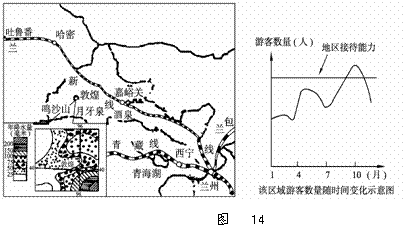 材料二:图14为敦煌-哈密地区旅游业相关资料示意图。