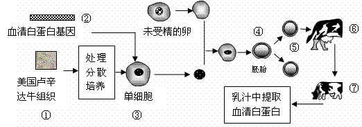 33.(8分)随着科学技术的发展,人们可以根据人类的需求来改造生物的性状,在许多领域取得了可喜的成果,下图是利用奶牛乳汁生产血清白蛋白的图解,根据下图回答: