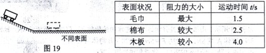 27.如图19所示,在“探究阻力对物体运动的影响”的实验中,使小车从斜面上由静止