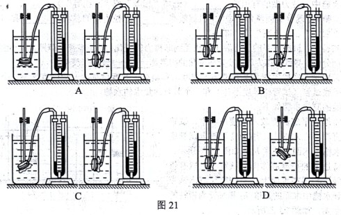 29.用调好的微小压强计和水进行“研究液体内部压强特点”的实验。实验后,善于画画的小惠根据记忆画出实验情景如图21所示。其中符合液体压强特点的是___________(填字母符号)。